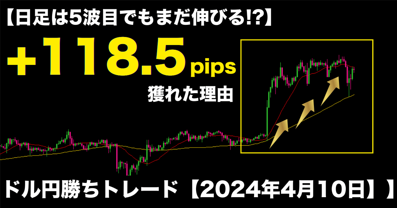 【日足は5波目でもまだ伸びる!?】ドル円ロングで+118.5pipsを取れた理由【2024年4月10日】|たろう@トレー…